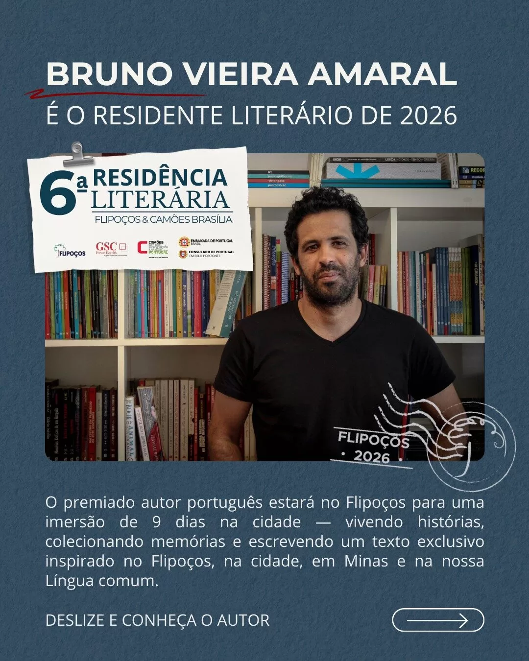 O Flipoços – Festival Literário Internacional de Poços de Caldas anuncia o nome do autor português selecionado para a 6ª Residência Literária Flipoços Camões 2026: o premiado escritor, cronista e tradutor Bruno Vieira Amaral, uma das vozes mais importantes e premiadas da literatura contemporânea portuguesa.