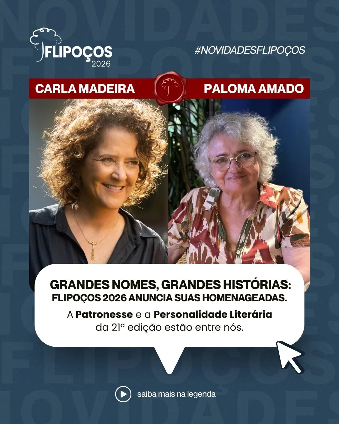 Carla Madeira participa do Flipoços no dia 25 de abril, sábado, quando receberá a homenagem como Patronesse do Festival e após se encontra com o público para um bate-papo e autógrafos. Já Paloma Amado, vai aproveitar para apresentar no dia 01 de maio, sexta, o livro “Pituco” obra que foi lançada em pequena tiragem há 10 anos pela Fundação Casa de Jorge Amado quando celebrou o centenário de Zélia Gattai. A obra será reeditada para novo lançamento no Flipoços 2026.