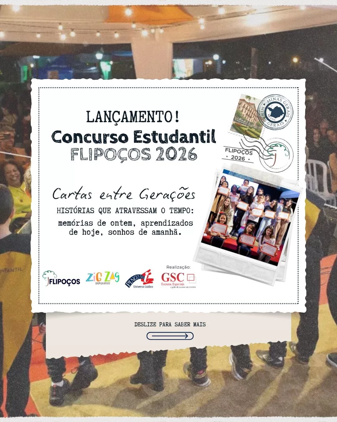 Desta vez, uma das mais importantes atividades para o público local, foi lançada no último dia 25 de novembro. Trata-se do tradicional Concurso Estudantil Flipoços, uma das ações mais queridas do público escolar e da população poços-caldense. A iniciativa envolve escolas municipais, estaduais e particulares, com ampla adesão de alunos do ensino fundamental e médio. Em 2025, o concurso recebeu mais de 400 inscrições entre redações e desenhos. A expectativa é que na edição de 2026 o número de escolas e alunos inscritos supere o deste ano por conta também do tema que é muito envolvente, “Cartas Entre Gerações – Histórias que atravessam o tempo: memórias de ontem, aprendizados de hoje, sonhos de amanhã”.
